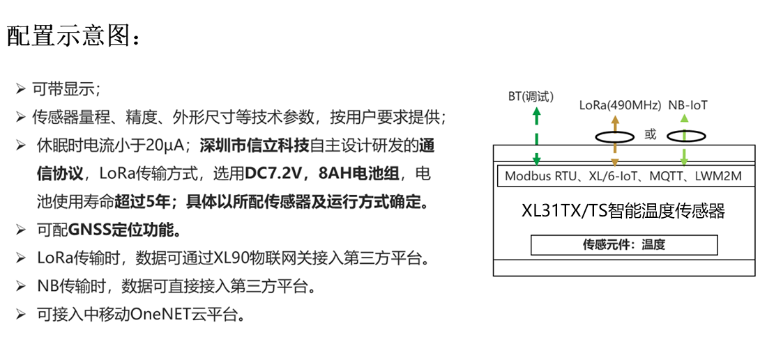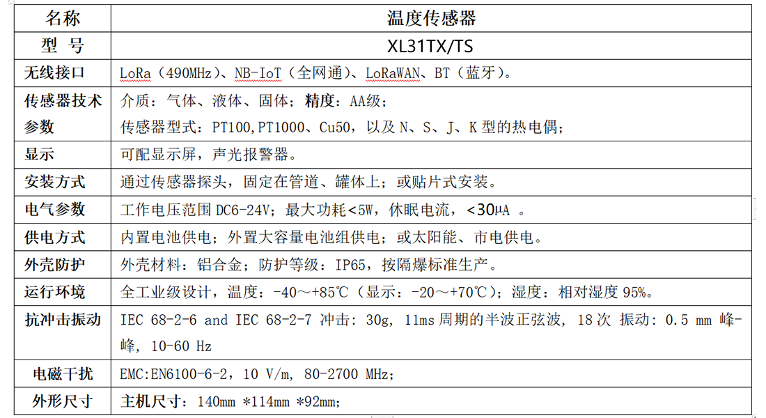 XL31TX/TS智能溫度傳感器,集成傳感元件、信息處理、無線通訊、電池供電等于一體。通訊中斷保存數(shù)據(jù),通訊恢復重傳數(shù)據(jù),超限主動上傳數(shù)據(jù),電池能量低上傳報警數(shù)據(jù)。