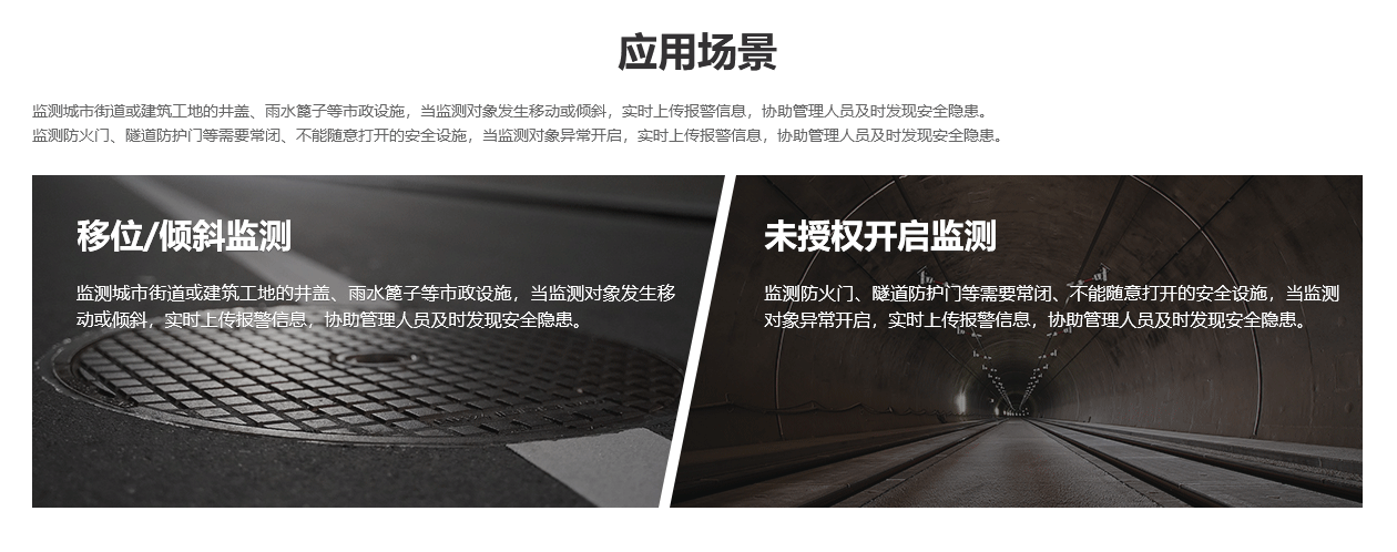 監(jiān)測城市街道或建筑工地的井蓋、雨水篦子等市政設(shè)施,當(dāng)監(jiān)測對象發(fā)生移動或傾斜,實時上傳報警信息,協(xié)助管理人員及時發(fā)現(xiàn)安全隱患。