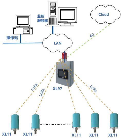 XL11系列傳感器采集設(shè)備運(yùn)行過(guò)程電動(dòng)機(jī)、減速機(jī)等零部件的溫度、振動(dòng)數(shù)據(jù),并通過(guò) LoRa 或 LoRaWAN 無(wú)線通信方式,接入XL97物聯(lián)網(wǎng)關(guān)終端,網(wǎng)關(guān)通過(guò)Ethernet、Wi-Fi、4G接口連接SCADS、DCS或云端監(jiān)控平臺(tái),支持MQTT、API、SOAP(WEB Service )、Modbus RTU/TCP協(xié)議。