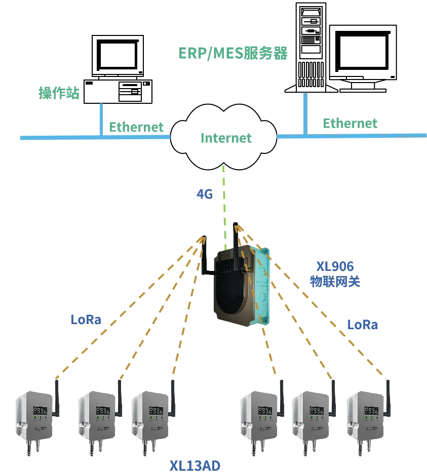 為規避布線破壞潔凈室氣密性,方案采用無線組網方式,XL13AD無線壓差傳感器通過LoRa無線傳輸壓差數據至XL90物聯網關,物聯網關通過4G傳輸數據至云平臺。